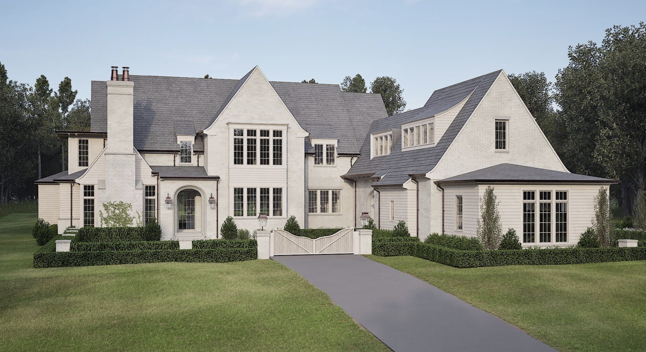 Our clients were on board with the vision of a cobblestone and pea gravel motor court (bordered by neatly clipped hedges, naturally) before they were sold on anything else. Molded stone arches and copper gutters and lanterns were also more or less a foregone conclusion. Real cedar siding with character and imperfect grace was always the hope over a man-made siding that would look suspiciously crisp. It was also clear that the landscaping and hardscaping would be an extension of the house—this wouldn’t be just a house with pretty plants settled politely around the edges of the place. A chalky green sports court out back by the pool made the casually elegant, European country-club aesthetic basically complete. This house is essentially a private country club with all the perks and none of the socializing. It’s a dream, really.